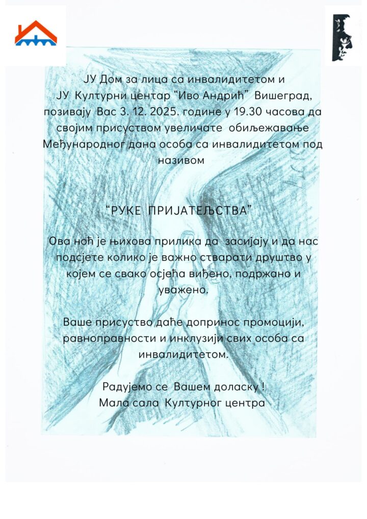 Јавна установа Дом за лица са инвалидитетом и Културни центар „Иво Андрић“ Вишеград организују обиљежавање Међународног дана особа са инвалидитетом, које ће бити одржано у сриједу 3. децембра 2025. године у Малој сали Културног центра.